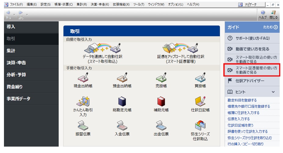 最新の「弥生26シリーズ」では、クイックナビゲータの最上部に「自動で取引入力」エリアが新設されました 。 これは、手入力から自動化・電子化へシフトしてほしいという弥生からの提案です 。