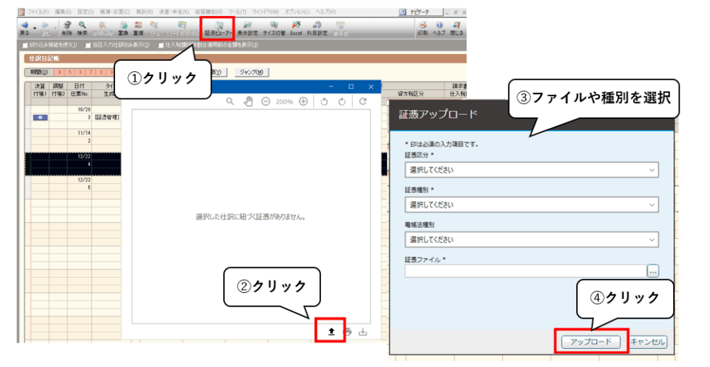3:証憑アップロード画面で、アップロードするファイルや証憑種別などを選択。