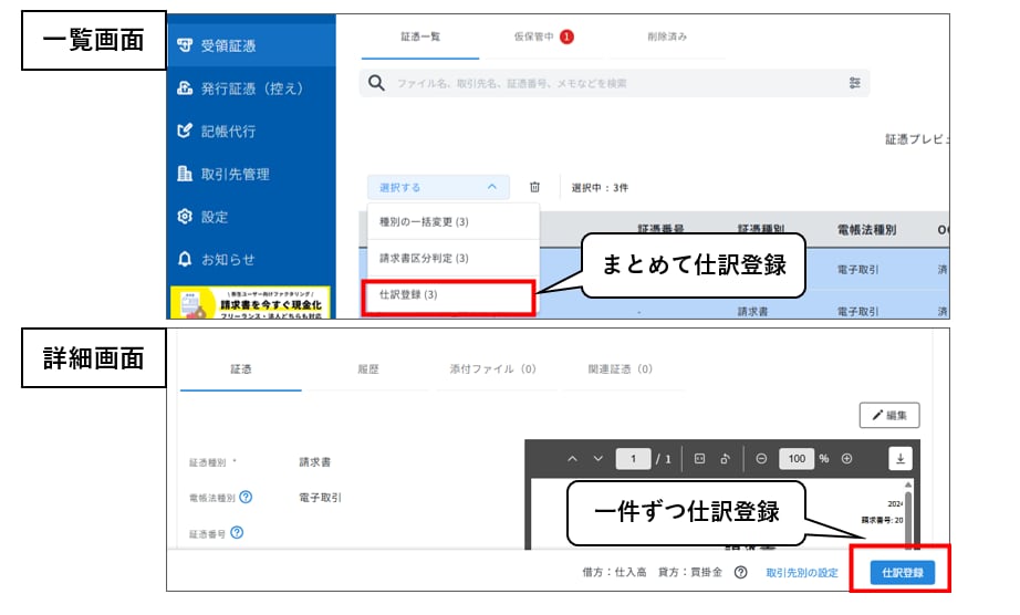 2:スマート証憑管理の一覧画面もしくは証憑の詳細画面で仕訳登録を実行。